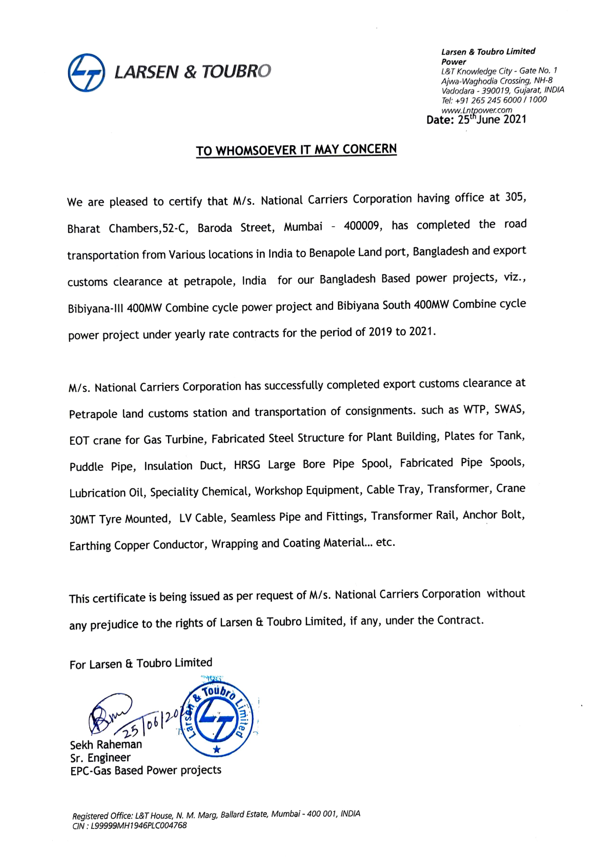 Mr. B.K. Bajoria and his team at National Carriers Corporation have made consistent efforts to ensure the smooth functioning of our shipments to Bangladesh. They have the highest recommendation from us.